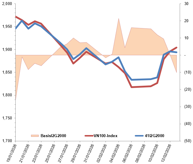 Ngoài ra, các hợp đồng tương lai VN100 tăng giảm đan xen trong phiên giao dịch ngày 13/02/2026. Cụ thể, 41I2G2000 (I2G2000) giảm 0.22%, còn 1,894.1 điểm; 41I2G3000 (I2G3000) giảm 0.32%, còn 1,894.7 điểm; hợp đồng 41I2G6000 (I2G6000) tăng 0.31%, đạt 1,895 điểm; hợp đồng 41I2G9000 (I2G9000) tăng 0.01%, đạt 1,890.2 điểm. Chỉ số cơ sở VN100-Index kết phiên ở mức 1,904.16 điểm.