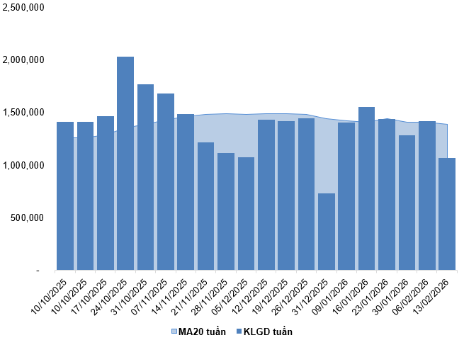 Khối lượng và giá trị giao dịch của thị trường phái sinh lần lượt tăng 15.6% và 15.37% so với phiên ngày 12/02/2026. Tính chung cả tuần, khối lượng và giá trị giao dịch tuần lần lượt giảm 25% và 25.1% so với tuần trước.