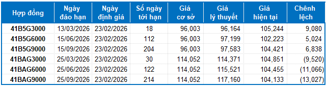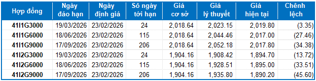 Dựa trên phương pháp định giá hợp lý với thời điểm khởi đầu ngày 23/02/2026, khung giá hợp lý của các hợp đồng tương lai đang được giao dịch trên thị trường được thể hiện như sau: