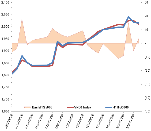 Trong tuần giao dịch 20-24/04/2026, nhìn chung 41I1G5000 diễn biến giằng co với các phiên tăng giảm đan xen. Cụ thể, các phiên đầu tuần diễn biến đi ngang trong biên độ hẹp với lợi thế có phần nghiêng về phe Long và I1G5000 bật tăng mạnh trong phiên giữa tuần khi bên mua chiếm ưu thế áp đảo. Bước sang các phiên cuối tuần, áp lực bán xuất hiện trở lại và dần mạnh lên khiến hợp đồng này thu hẹp đà tăng và đóng cửa tại mốc 2,015 điểm, tăng 27.1 điểm so với tuần trước.