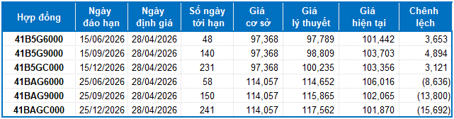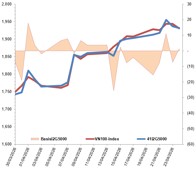 Ngoài ra, các hợp đồng tương lai VN100 tăng giảm trái chiều trong phiên giao dịch ngày 24/04/2026. Cụ thể, 41I2G5000 (I2G5000) tăng 0.34%, đạt 1,932 điểm; 41I2G6000 (I2G6000) giảm 1.11%, còn 1,907.1 điểm; hợp đồng 41I2G9000 (I2G9000) tăng 0.31%, đạt 1,918 điểm; hợp đồng 41I2GC000 (I2GC000) giảm 0.67%, còn 1,920 điểm. Chỉ số cơ sở VN100-Index kết phiên ở mức 1,930.67 điểm.