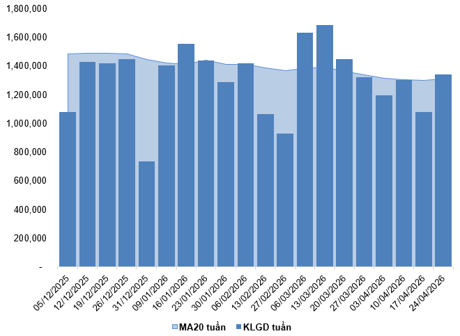 Khối lượng và giá trị giao dịch của thị trường phái sinh lần lượt giảm 25.6% và 24.71% so với phiên ngày 23/04/2026. Tính chung cả tuần, khối lượng và giá trị giao dịch tuần lần lượt tăng 24.51% và 28.04% so với tuần trước.