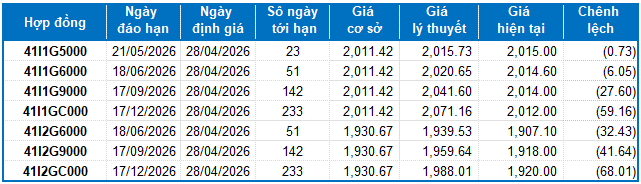 Các hợp đồng tương lai VN30 đồng loạt giảm điểm trong phiên giao dịch ngày 24/04/2026. Cụ thể, 41I1G5000 (I1G5000) giảm 0.21%, còn 2,015 điểm; 41I1G6000 (I1G6000) giảm 0.16%, còn 2,014.6 điểm; hợp đồng 41I1G9000 (I1G9000) giảm 0.25%, còn 2,014 điểm; hợp đồng 41I1GC000 (I1GC000) giảm 0.14%, còn 2,012 điểm. Chỉ số cơ sở VN30-Index kết phiên ở mức 2,011.42 điểm.