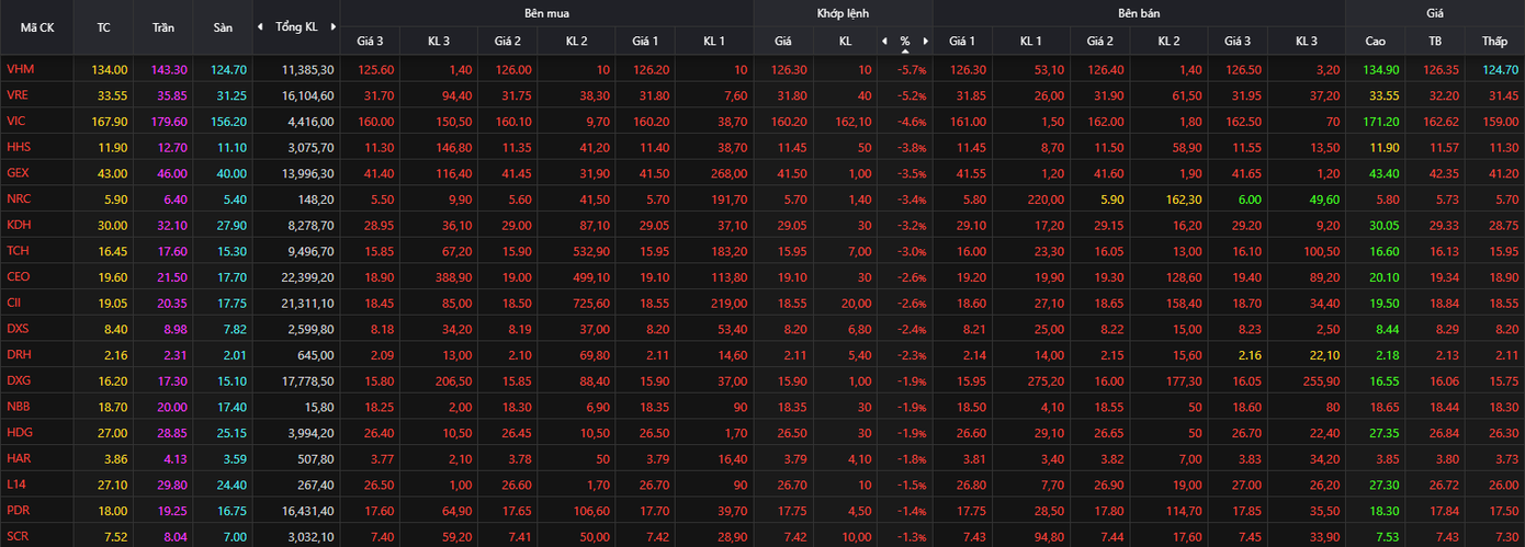 Áp lực lớn nhất trong phiên đến từ nhóm cổ phiếu bất động sản , đặc biệt là các mã thuộc “họ” Vingroup. Sau nhiều phiên đóng vai trò nâng đỡ chỉ số, VIC và VHM đồng loạt quay đầu giảm sâu khiến nỗ lực giữ mốc 1.900 điểm nhanh chóng thất bại. Đà điều chỉnh của nhóm trụ kéo theo sắc đỏ lan rộng trong toàn ngành bất động sản, với hàng loạt cổ phiếu giảm giá như DXG, PDR, DIG, GEX, KDH…
