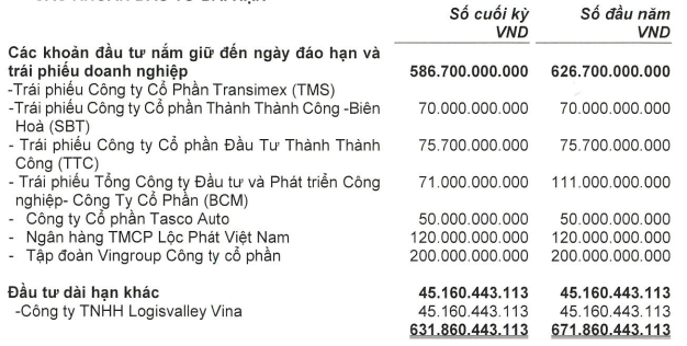 Bên cạnh các tài sản tài chính ngắn hạn, SSV còn nắm giữ danh mục đầu tư dài hạn gồm trái phiếu doanh nghiệp và cổ phiếu với tổng giá trị 631 tỷ đồng. Đáng chú ý, Công ty có khoản đầu tư 45.2 tỷ đồng vào Công ty TNHH Logisvalley Vina, tỷ lệ biểu quyết là 5.82%. Doanh nghiệp này hoạt động trong lĩnh vực cho thuê hạ tầng và nhà xưởng tại Bắc Ninh.