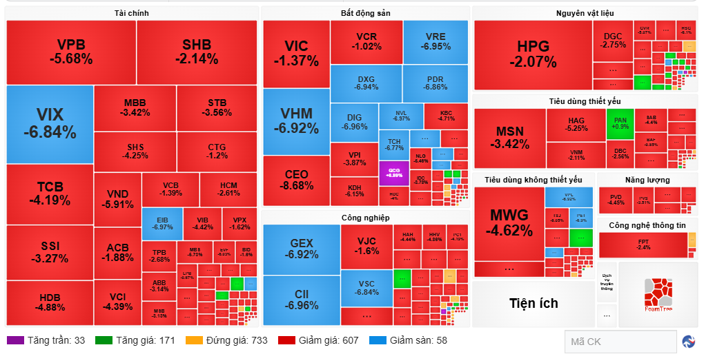 Chỉ riêng thị trường Việt Nam, chỉ số VN-Index giảm 52 điểm (tương đương 3.06%) xuống 1,647 điểm, VN30 rớt hơn 57 điểm (tương đương 2.98%) xuống 1,867 điểm. Sắc đỏ bao trùm thị trường với thanh khoản tăng mạnh so với phiên trước. Theo VietstockFinance, thanh khoản lên gần 28,000 tỷ đồng trên cả 3 sàn.