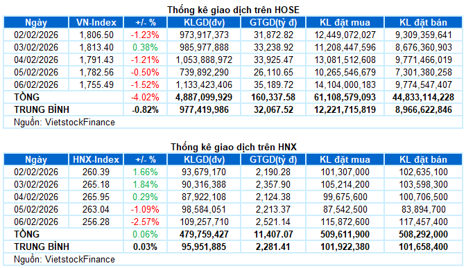 Giao dịch: Các chỉ số chính đồng loạt giảm sâu trong phiên giao dịch ngày 06/02. Cụ thể, VN-Index giảm 1.52%, xuống còn 1,755.49 điểm; HNX-Index cũng giảm sâu 2.57%, dừng tại 256.28 điểm. Xét cho cả tuần, VN-Index mất tổng cộng 73.55 điểm (-4.02%), trong khi HNX-Index chỉ còn tăng nhẹ 0.15 điểm (+0.06%).