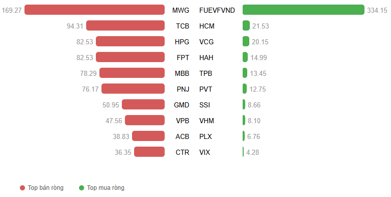 Về mức độ ảnh hưởng, 10 cổ phiếu ảnh hưởng tích cực nhất đã mang về cho VN-Index tổng cộng 16.08 điểm, trong đó VIC đóng góp nhiều nhất với 4.3 điểm tăng. Còn ở chiều ngược lại, MCH và STB là hai mã gây áp lực lớn nhất, nhưng cũng chỉ lấy đi tổng cộng 0.75 điểm của chỉ số.