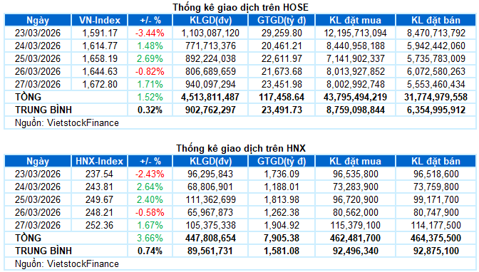 Giao dịch: Các chỉ số chính bật tăng trong phiên giao dịch ngày 27/03. Cụ thể, VN-Index tăng 1.71%, lên mức 1,672.8 điểm. HNX-Index cũng tăng 1.67%, đạt 252.36 điểm. Xét cho cả tuần, VN-Index tăng 24.99 điểm (+1.52%), HNX-Index cũng tăng 8.9 điểm (+3.66%).