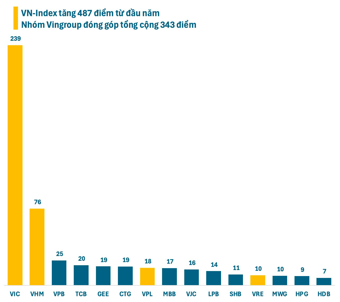 Với cú bứt phá ngoạn mục, riêng cổ phiếu VIC đã đóng góp 239 điểm vào VN-Index từ đầu năm. Tính chung 4 cổ phiếu của tỷ phú Phạm Nhật Vượng (VIC, VHM, VPL, VRE), mức đóng góp vào chỉ số lên đến 343 điểm trên tổng số 487 điểm trong khoảng thời gian này.