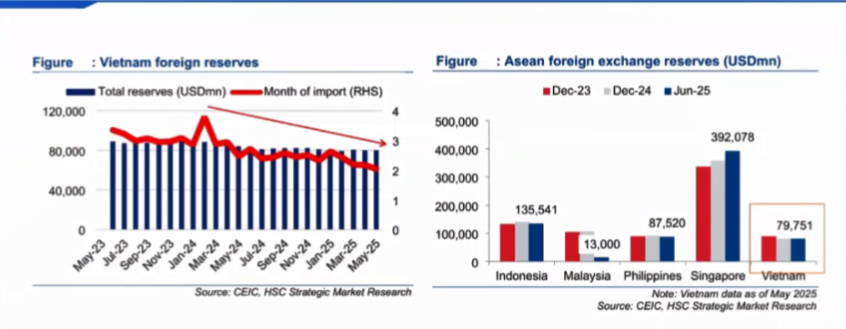 Một rủi ro khác liên quan đến tỷ giá là dự trữ ngoại hối của Việt Nam chỉ khoảng 80 tỷ USD (tính đến tháng 5/2025), tương đương 2 tháng nhập khẩu là mức chưa an toàn. Điều này càng củng cố lo ngại của khối ngoại.