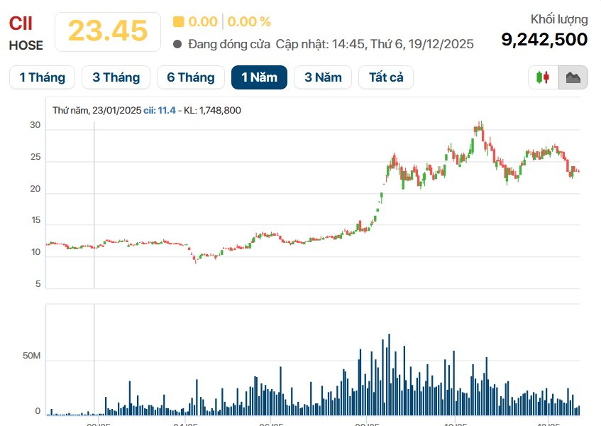Trên thị trường chứng khoán, cổ phiếu CII ghi nhận các diễn biến tăng giảm đan xen. Kết thúc phiên giao dịch ngày 19/12, thị giá CII đạt 23.450 đồng/cổ phiếu . So với thời điểm đầu năm, mức giá này đã nhân 2, phản ánh kỳ vọng của thị trường vào các dự án hạ tầng mà doanh nghiệp đang triển khai.