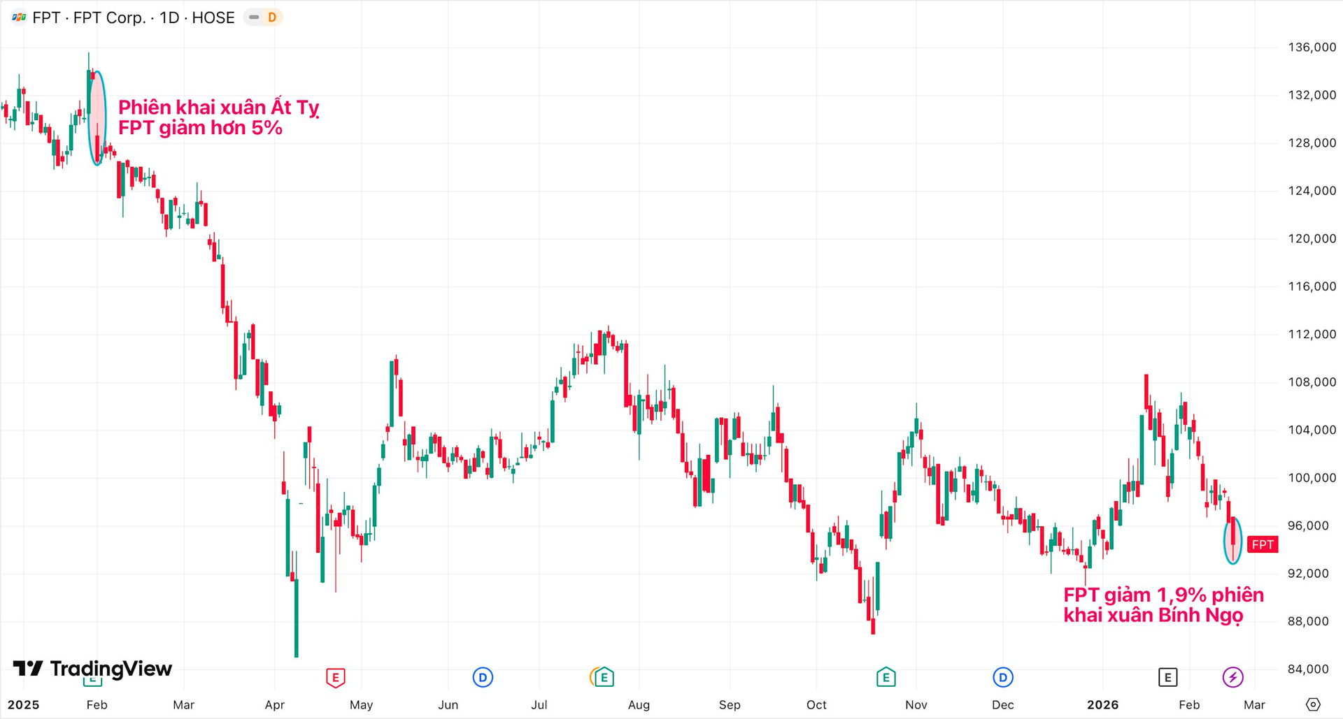 Thị trường chứng khoán vừa có phiên khai xuân Bính Ngọ tưng bừng rực rỡ, VN-Index tăng hơn 36 điểm với sắc xanh tím áp đảo. Thế nhưng, niềm vui không dành cho tất cả. Cổ phiếu FPT lạc nhịp khi giảm 1,9% xuống mức 94.500 đồng/cp, thấp nhất kể từ đầu tháng 1. Vốn hóa thị trường tương ứng lùi về mức 160.000 tỷ đồng.