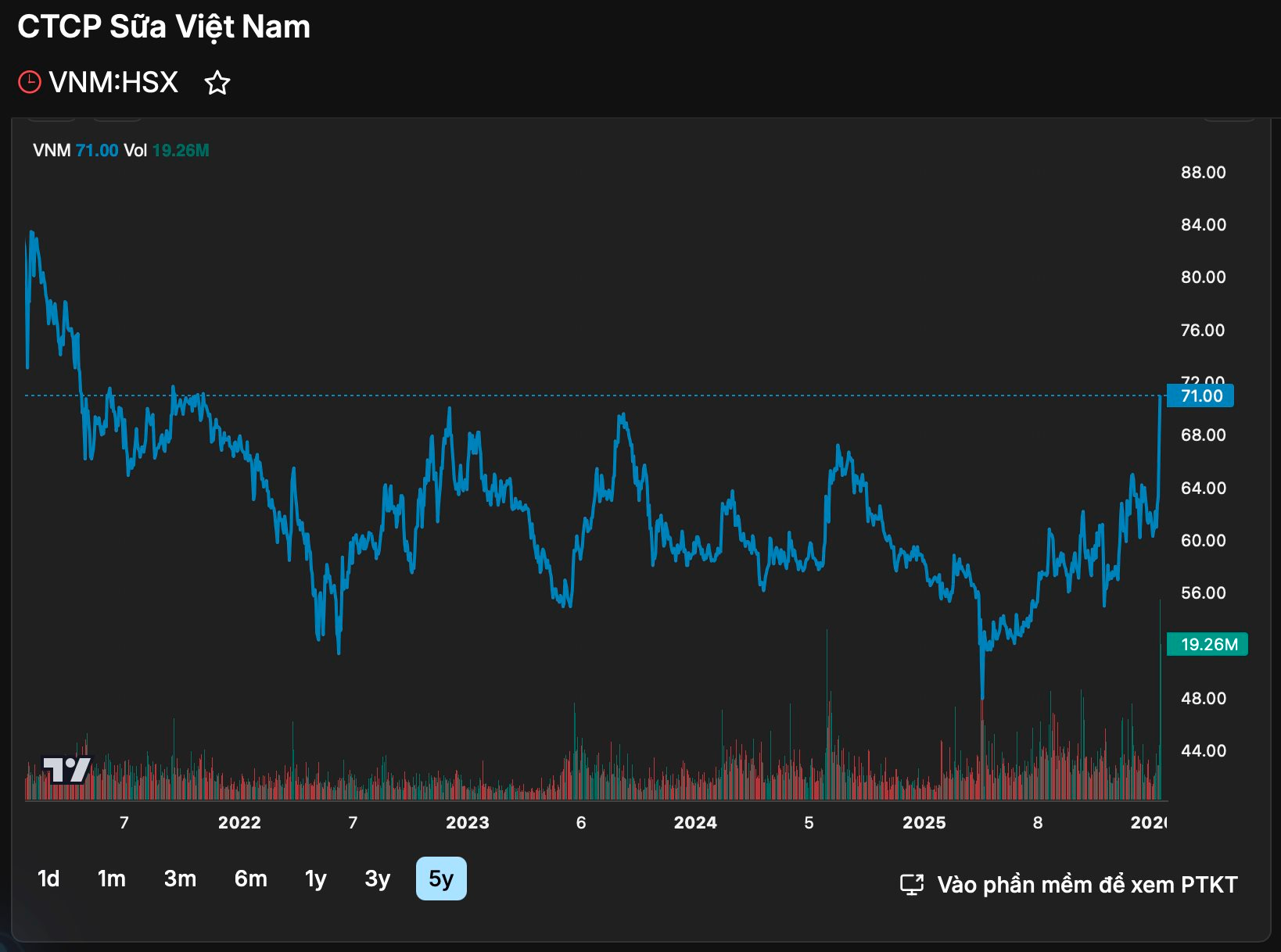Cổ đông Nhà nước quyết tâm thoái bớt vốn tại Vinamilk trong bối cảnh cổ phiếu đầu ngành sữa đang tăng bốc đầu. Từ đầu năm 2026, thị giá VNM đã tăng 16% lên mức 71.000 đồng/cp, cao nhất trong hơn 4 năm, kể từ tháng 11/2021. Vốn hóa thị trường tương ứng gần 150.000 tỷ đồng.