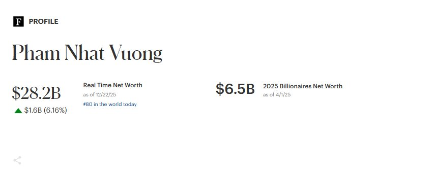 Cùng với nhịp tăng của cổ phiếu VIC, tài sản của Chủ tịch Vingroup Phạm Nhật Vượng cũng tăng tương ứng. Theo số liệu thời gian thực của Forbes, tài sản của ông đạt 28,2 tỷ USD, tăng thêm 1,6 tỷ USD chỉ trong một ngày. Thành tích này đưa ông nằm top 80 trong danh sách những người giàu nhất thế giới và thiết lập mức kỷ lục mới tại Việt Nam.