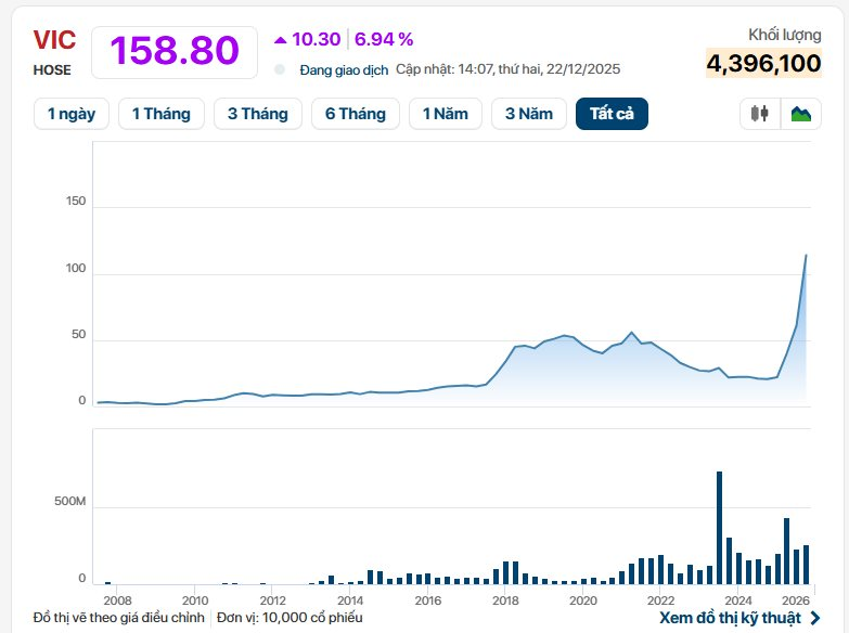 Thị trường chứng khoán Việt Nam khởi động tuần mới đầy hưng phấn nhờ sự dẫn dắt mạnh mẽ từ nhóm cổ phiếu vốn hóa lớn. Tâm điểm đổ dồn về cổ phiếu VIC của Vingroup khi nhanh chóng xác lập mức giá trần lên mốc 158.800 đồng/cp, thậm chí còn trong tình trạng ‘trắng bên bán’. Đây đã là phiên tăng mạnh thứ hai liên tiếp của VIC, đưa thị giá áp sát đỉnh lịch sử.