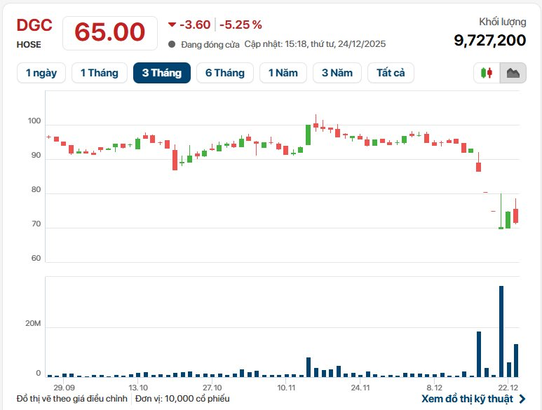Cụ thể, kết phiên 14/12, giá cổ phiếu DGC của CTCP Tập đoàn Hóa chất Đức Giang ở mức 65.000 đồng/cổ phiếu, giảm 5,25% so với phiên trước, khối lượng cổ phiếu giao dịch khớp lệnh đạt gần 9,4 triệu đơn vị.