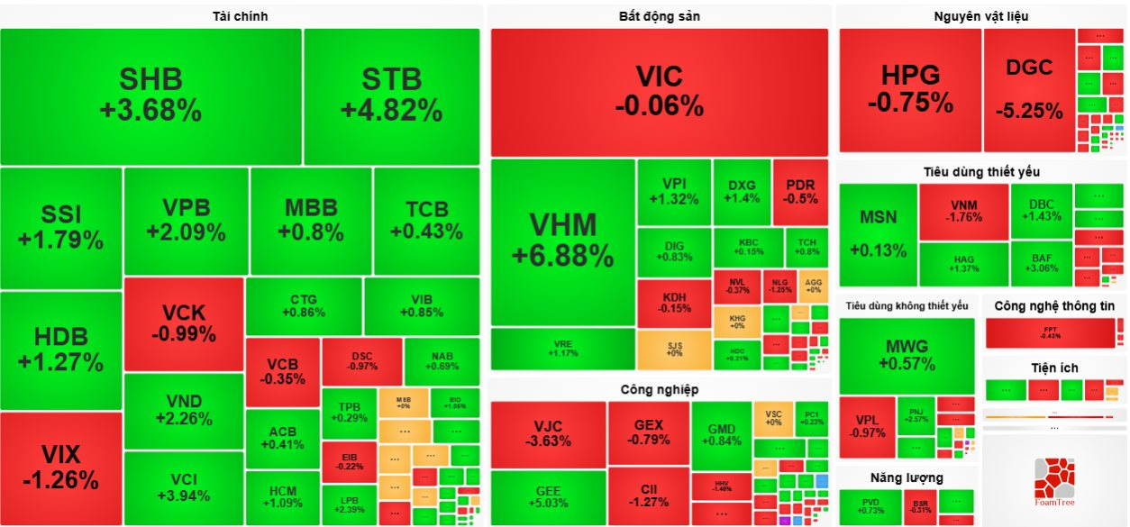 Cổ phiếu bất động sản tiếp đà “hưng phấn”, với: VHM +6,88%, VRE +1,17%, VPI +1,32%, TAL +2,18%, DXS +3,04%, CRE +3,45%, …
