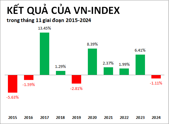 Biểu hiện của VN-Index cũng cho thấy tháng 11 là khoảng thời gian khá tích cực khi trong 1 thập kỷ trở lại đây, chỉ số này đã có 6 năm tăng điểm, trong đó có chuỗi 4 năm liên tiếp từ 2020-2023.