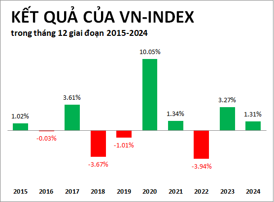 Không chỉ thể hiện ở số cổ phiếu thường tăng, sự tích cực của tháng cuối năm còn thể hiện qua kết quả của VN-Index. Trong 1 thập kỷ trở lại đây (2015-2024), VN-Index có đến 6 năm tăng điểm trong tháng 12.