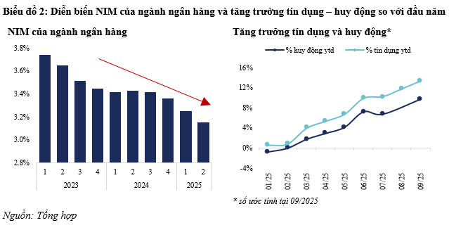 Từ đầu năm đến tháng 9/2025, tín dụng ước tăng khoảng 13% trong khi huy động chỉ tăng khoảng 10%, khiến hệ số sử dụng vốn tiến sát vùng cao và biên đệm thanh khoản mỏng dần. Khi bước vào quý cuối năm, nhu cầu vốn phục vụ sản xuất – kinh doanh và chi tiêu mùa lễ tết thường tăng, làm sức ép cân đối nguồn càng rõ. Để bảo đảm nguồn cho vay và yêu cầu an toàn thanh khoản, nhiều ngân hàng có thể phải nâng lãi suất huy động ở một số kỳ hạn hoặc tăng cường các chương trình huy động, qua đó đẩy chi phí vốn đi lên. Chi phí đầu vào nhích tăng nhanh hơn tốc độ điều chỉnh lãi cho vay sẽ khiến biên lãi ròng phục hồi chậm, thậm chí co hẹp trong các tháng cao điểm.