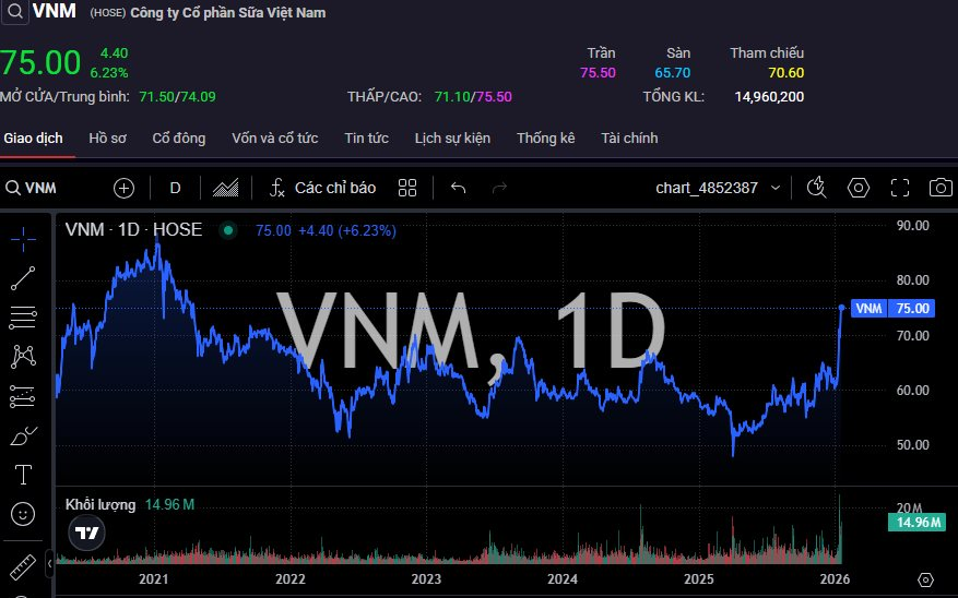 Đà tăng mạnh của VNM xuất hiện trong bối cảnh cổ đông Nhà nước mới đây lên kế hoạch thoái bớt vốn. Cụ thể, Công ty TNHH MTV Đầu tư SCIC vừa đăng ký bán 1,45 triệu cổ phiếu VNM (tương đương 0,069% vốn điều lệ) nhằm tái cơ cấu danh mục đầu tư. Giao dịch dự kiến thực hiện theo phương thức khớp lệnh và/hoặc thỏa thuận trong giai đoạn 19/1 – 17/2. Trước đó, kế hoạch bán ra cùng lượng cổ phiếu này từng không thành công trong khoảng 10/12/2025 – 8/1/2026 do biến động thị trường.