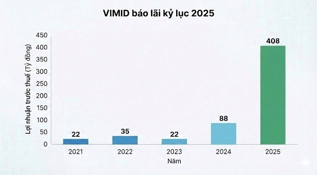 Lũy kế cả năm 2025, doanh thu thuần của VIMID đạt 8.050 tỷ đồng, tăng 107% so với năm 2024 (3.891 tỷ đồng). Lợi nhuận trước thuế đạt 408 tỷ đồng, tăng 362% so với năm 2024 (88,3 tỷ đồng). Lợi nhuận sau thuế đạt 326 tỷ đồng, cao gấp gần 5 lần so với cùng kỳ. Đây đều là mức cao nhất lịch sử của doanh nghiệp này.