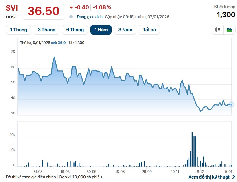 Trên thị trường chứng khoán, cổ phiếu SVI đóng cửa phiên giao dịch ngày 06/01/2026 quanh vùng giá 36.500 đồng/cp. Thanh khoản của mã này duy trì ở mức thấp do cơ cấu cổ đông cô đặc.