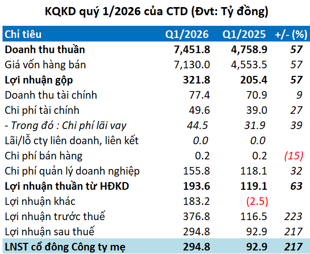 Năm tài chính 2026 (từ 01/07/2025 đến 30/06/2026), CTD đặt mục tiêu doanh thu hợp nhất 30,000 tỷ đồng và lợi nhuận sau thuế 700 tỷ đồng, tăng lần lượt 21% và 54% so với kết quả năm tài chính 2025. Với kế hoạch này, Doanh nghiệp đã thực hiện được 25% và 42% sau quý đầu tiên.