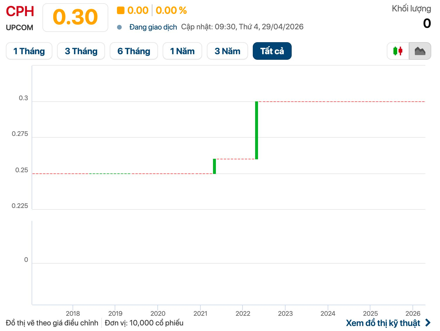 Trên thị trường chứng khoán, do cơ cấu cổ đông cô đặc nên dù kinh doanh có lãi và duy trì lịch sử trả cổ tức bằng tiền mặt liên tục trong 10 năm qua với tỷ lệ cao, cổ phiếu CPH trên sàn UPCoM gần như không có thanh khoản, và “đứng im” ở mức giá 300 đồng/cp.Năm 2026, CPH đặt kế hoạch tổng doanh thu 130 tỷ đồng và lợi nhuận sau thuế 10 tỷ, lần lượt giảm 16% và 9% so với thực hiện cùng kỳ năm ngoái. Tỷ lệ cổ tức tiền mặt cho năm 2026 dự kiến đạt mức 18,18%.