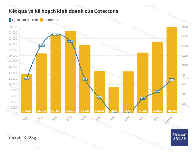 Theo tờ trình kế hoạch kinh doanh, Coteccons đặt mục tiêu doanh thu năm tài chính 2026 (từ 1/7/2025 đến 30/6/2026) đạt 30.000 tỷ đồng, lợi nhuận sau thuế 700 tỷ đồng; tăng lần lượt 21% và 54% so với kết quả năm tài chính 2025 (YoY).