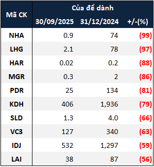 Ở chiều giảm, Tổng Công ty Đầu tư Phát triển Nhà và Đô thị Nam Hà Nội (HOSE: NHA) có mức giảm của để dành nhiều nhất ngành với 99%, từ 74 tỷ đồng hồi đầu năm về dưới 1 tỷ đồng vào cuối tháng 9, do sự biến mất của 14.4 tỷ đồng tiền trả trước của khách hàng nhận chuyển nhượng quyền sử dụng đất tại dự án khu dân cư Mộc Bắc và 60 tỷ đồng trả trước của CTCP Đầu tư Phát triển Hạ tầng KCN Đồng Văn III.