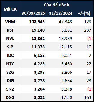Dù tăng mạnh nhưng giá trị của để dành của KSF xếp thứ 2 toàn ngành, đứng sau Vinhomes (HOSE: VHM) với hơn 108.5 ngàn tỷ đồng, gấp 2.3 lần đầu năm. Trong đó, số tiền khách hàng thanh toán trước theo các hợp đồng chuyển nhượng bất động sản đạt 72.9 ngàn tỷ đồng, gấp 2.1 lần.