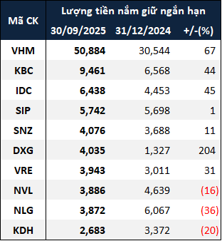 10 doanh nghiệp BĐS có tiền mặt nhiều nhất tại thời điểm 30/09/2025 (Đvt: Tỷ đồng)