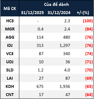 Top 10 doanh nghiệp BĐS có của để dành giảm nhiều nhất năm 2025 (Đvt: Tỷ đồng)
