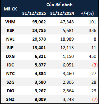 Xếp sau KSF là CTCP Tập đoàn Đầu tư Địa ốc No Va (HOSE: NVL) với gần 20.6 ngàn tỷ đồng, tăng 8%. Năm qua, NVL đã bàn giao thực tế 952 sản phẩm từ các dự án. Tính đến cuối 2025, NovaWorld Phan Thiet đã bàn giao gần 1,500 sản phẩm, trong đó 750 căn đã hoàn thiện nội thất và đưa vào khai thác cho thuê; Aqua City đã bàn giao hơn 1,000 sản phẩm, gần 2,400 bất động sản đã đủ điều kiện ký hợp đồng mua bán; NovaWorld Ho Tram đã bàn giao gần 600 sản phẩm.