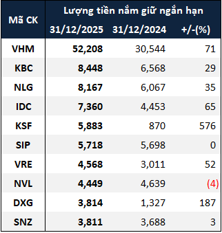 10 doanh nghiệp BĐS có tiền mặt nhiều nhất vào cuối năm 2025 (Đvt: Tỷ đồng)