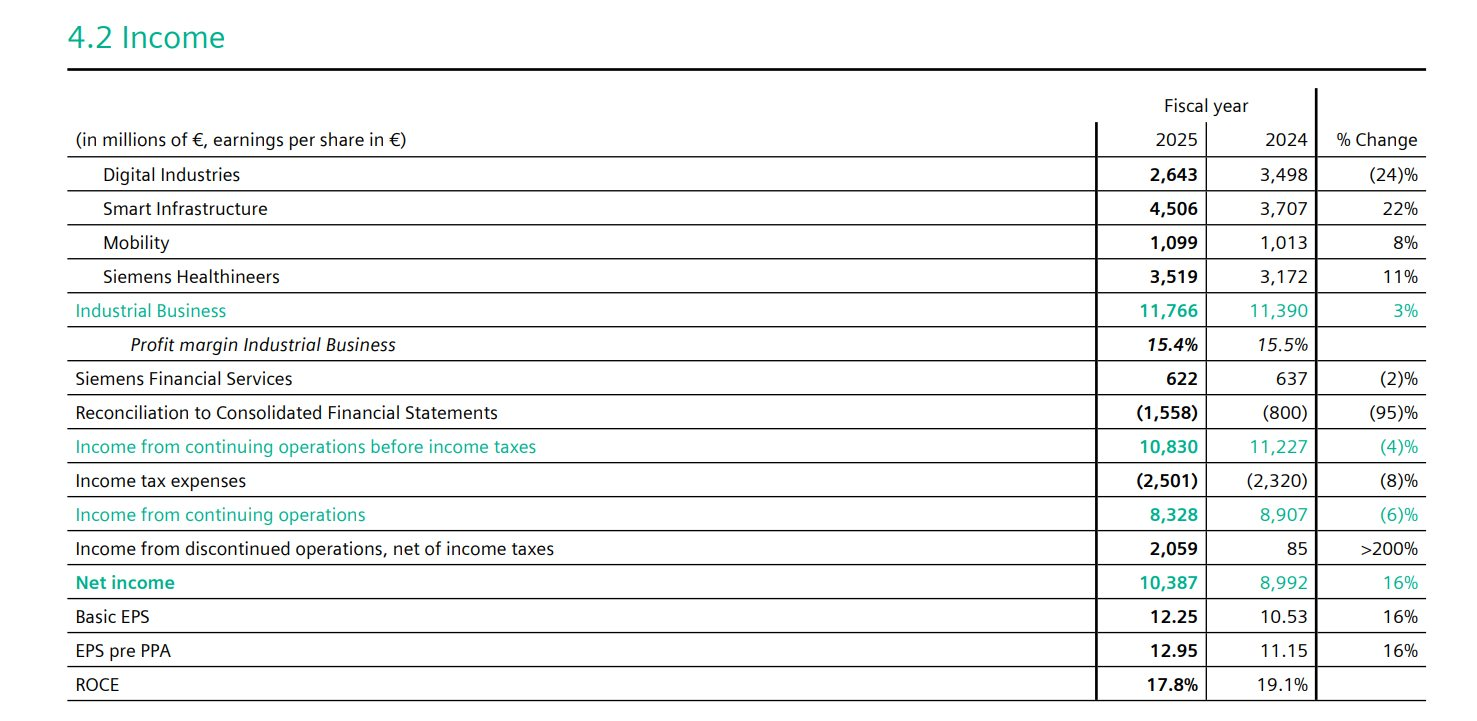 Theo báo cáo thường niên của Siemens cho năm tài khóa 2025 (kết thúc tháng 9/2025), tổng doanh thu (revenue) là 78,9 tỷ Euro, tăng 4%, còn lợi nhuận sau thuế (net income) đạt 10,4 tỷ Euro, tăng 16%.