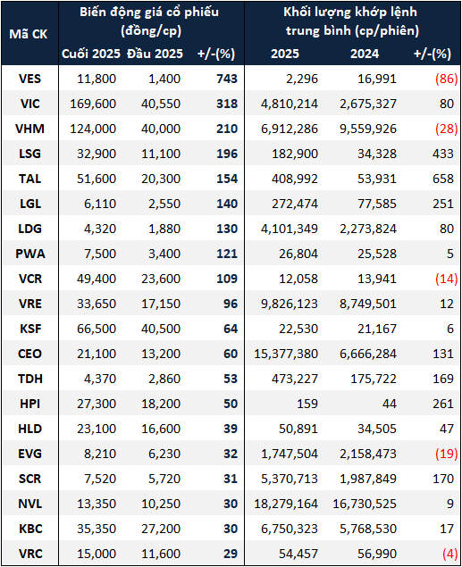 Mức tăng mạnh của chỉ số ngành chủ yếu nhờ một nhóm cổ phiếu dẫn dắt. Trong đó, các doanh nghiệp thuộc “họ Vingroup” như VIC, VHMVRE đều góp mặt vào Top 10 cổ phiếu bất động sản tăng mạnh nhất năm. VIC cũng là cổ phiếu ảnh hưởng lớn nhất đến VN-Index năm 2025, góp phần giúp chỉ số chinh phục nhiều ngưỡng kháng cự quan trọng.