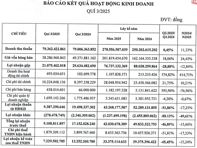 Nửa đầu 2025, doanh thu đạt 191 tỷ đồng (giảm 23%), doanh thu tài chính 264 tỷ đồng; chi phí lãi vay tăng lên 175 tỷ đồng khiến lợi nhuận sau thuế còn 150 tỷ đồng (giảm 22%).