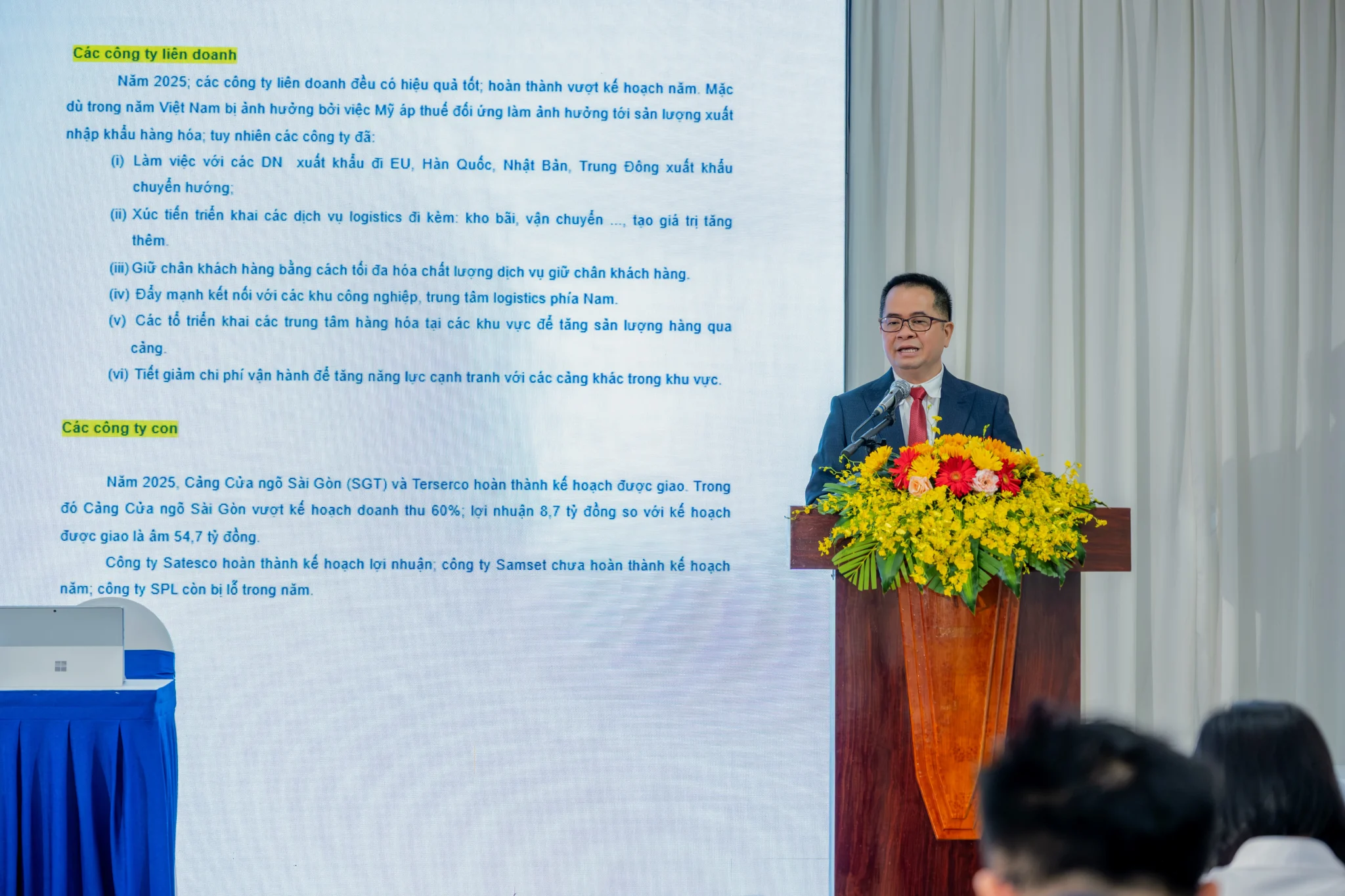 Ông Nguyễn Lê Chơn Tâm – Tổng giám đốc Cảng Sài Gòn trình Đại hội kết quả sản xuất kinh doanh năm 2025 và kế hoạch năm 2026.
