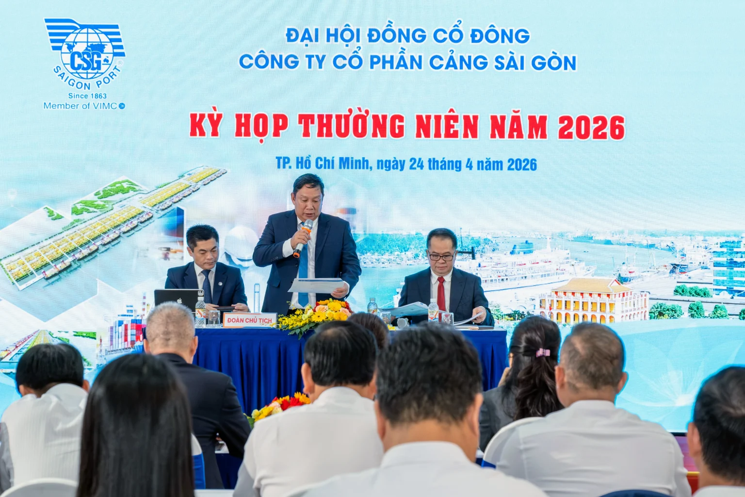 Đại hội vinh dự đón tiếp ông Nguyễn Cảnh Tĩnh, Chủ tịch Hội đồng quản trị Tổng công ty Hàng hải Việt Nam (VIMC), cùng đại diện các cổ đông, thể hiện sự quan tâm sâu sắc đối với định hướng phát triển của Cảng Sài Gòn trong giai đoạn mới.