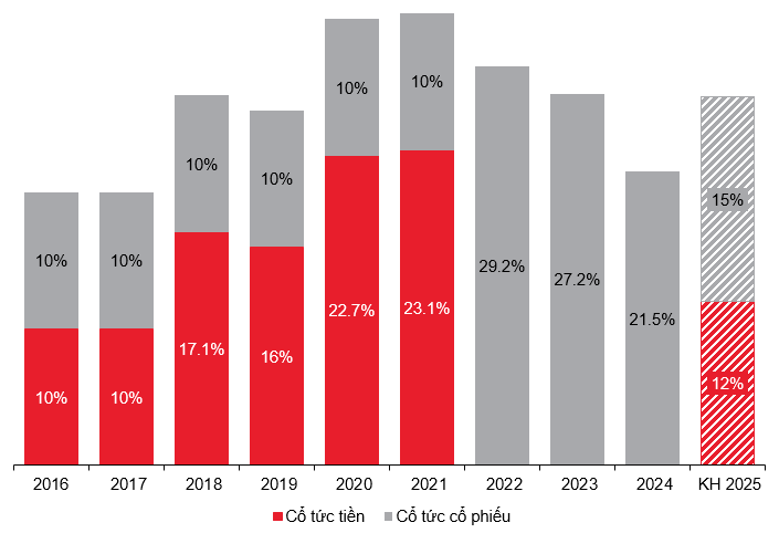 Trong 5 năm tới, hội đồng quản trị định hướng duy trì chính sách cổ tức kết hợp giữa tiền mặt và cổ phiếu. Trong đó, cổ tức tiền mặt dự kiến ở mức 10-15% mỗi năm, trong khi tỷ lệ cổ tức bằng cổ phiếu sẽ được cân đối dựa trên kế hoạch tăng trưởng lợi nhuận và kế hoạch đầu tư hàng năm.