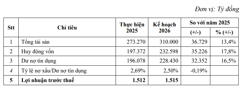 Mục tiêu cuối cùng của chúng tôi là tăng trưởng tín dụng bám sát hạn mức do Ngân hàng Nhà nước cấp, đồng thời kiểm soát chặt chẽ chất lượng tài sản, đảm bảo tỷ lệ nợ xấu năm 2026 duy trì ở mức dưới 2.5%.