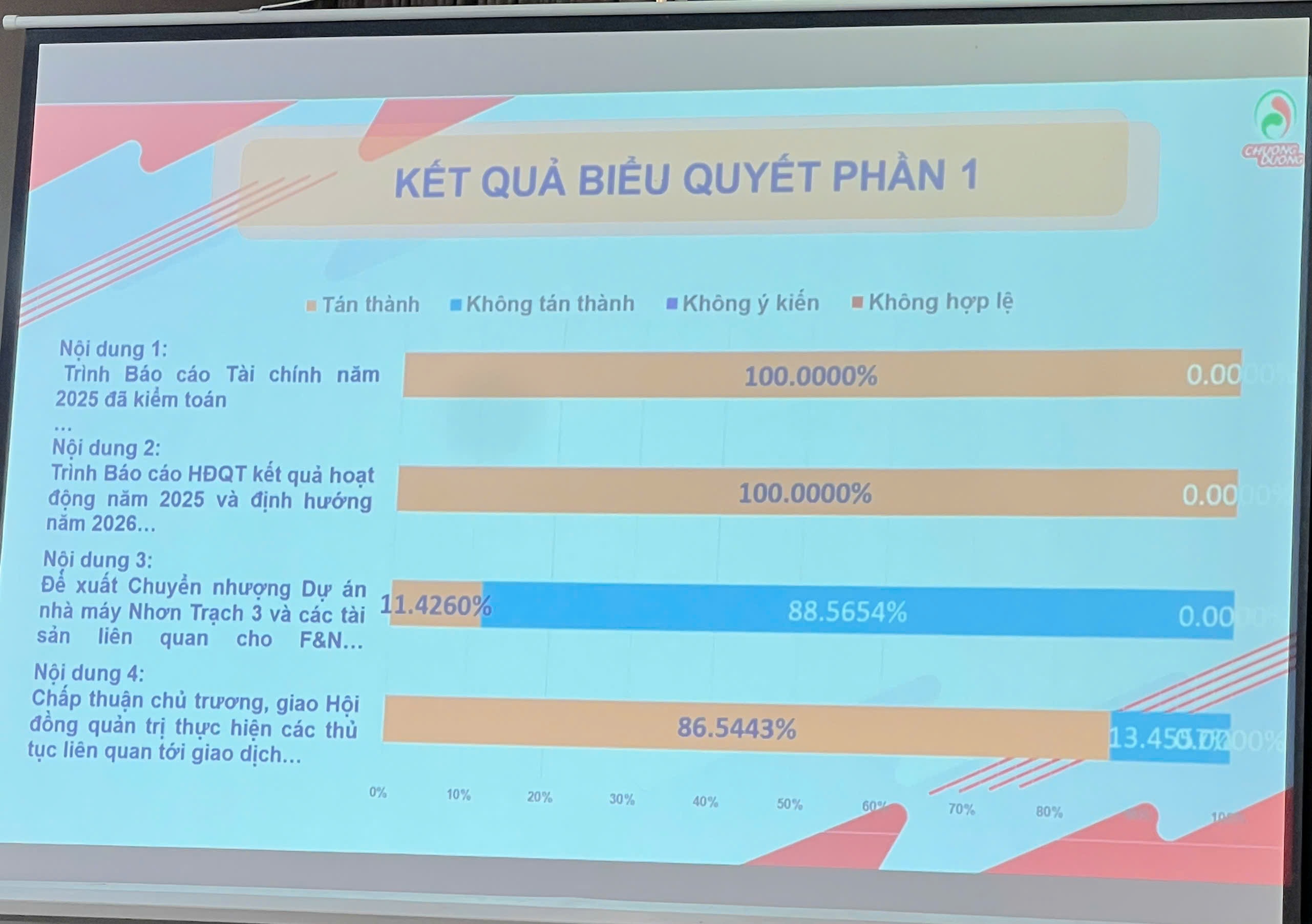 Sáng ngày 21/04, CTCP Nước giải khát Chương Dương (UPCoM: SCD) tổ chức ĐHĐCĐ thường niên 2026 với sự tham dự của 40 cổ đông, đại diện 72% tổng số cổ phần có quyền biểu quyết. Đại hội đã thông qua nhiều nội dung liên quan đến kế hoạch kinh doanh, phân phối lợi nhuận và sửa đổi điều lệ song tiếp tục không chấp thuận phương án chuyển nhượng Nhà máy Nhơn Trạch 3 và các tài sản liên quan.