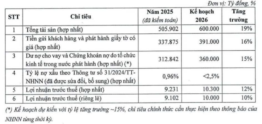 Tăng trưởng tín dụng dự kiến tăng 15% so với đầu năm, đưa tổng dư nợ lên 360,000 tỷ đồng, tăng trưởng huy động đạt 16% với tổng tiền gửi khách hàng và giấy tờ có giá đạt 391,000 tỷ đồng. Tổng tài sản hợp nhất mục tiêu đạt 600,000 tỷ, tăng 19%. Tỷ lệ nợ xấu kiểm soát dưới 2.5%.