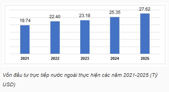 Năm 2025, vốn đầu tư trực tiếp nước ngoài (FDI) thực hiện ước đạt 27.62 tỷ USD, tăng 9% so với năm trước, mức cao nhất 5 năm qua. Trong đó, hoạt động kinh doanh bất động sản 1.93 tỷ USD, chiếm 7%.