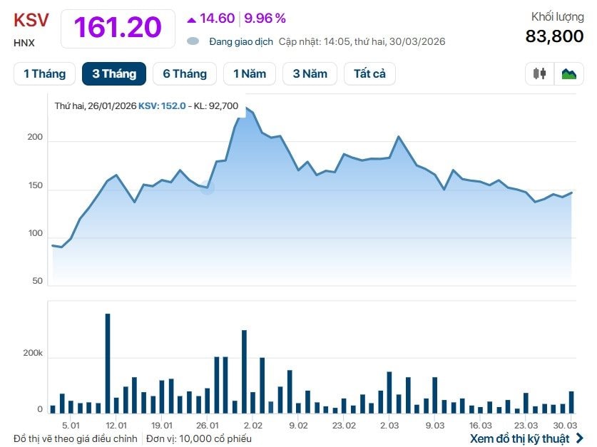 Đà tăng của cổ phiếu KSV xuất hiện sau khi doanh nghiệp công bố tài liệu Đại hội đồng cổ đông thường niên năm 2026. Theo đó, Vimico dự kiến chi trả cổ tức năm 2025 với tổng giá trị 2.380 tỷ đồng, tương ứng tỷ lệ 119% (khoảng 11.900 đồng/cổ phiếu). Mức chi trả này vượt xa kế hoạch 15% từng được thông qua tại đại hội năm trước, dù vẫn thấp hơn mức 150% của năm 2024.