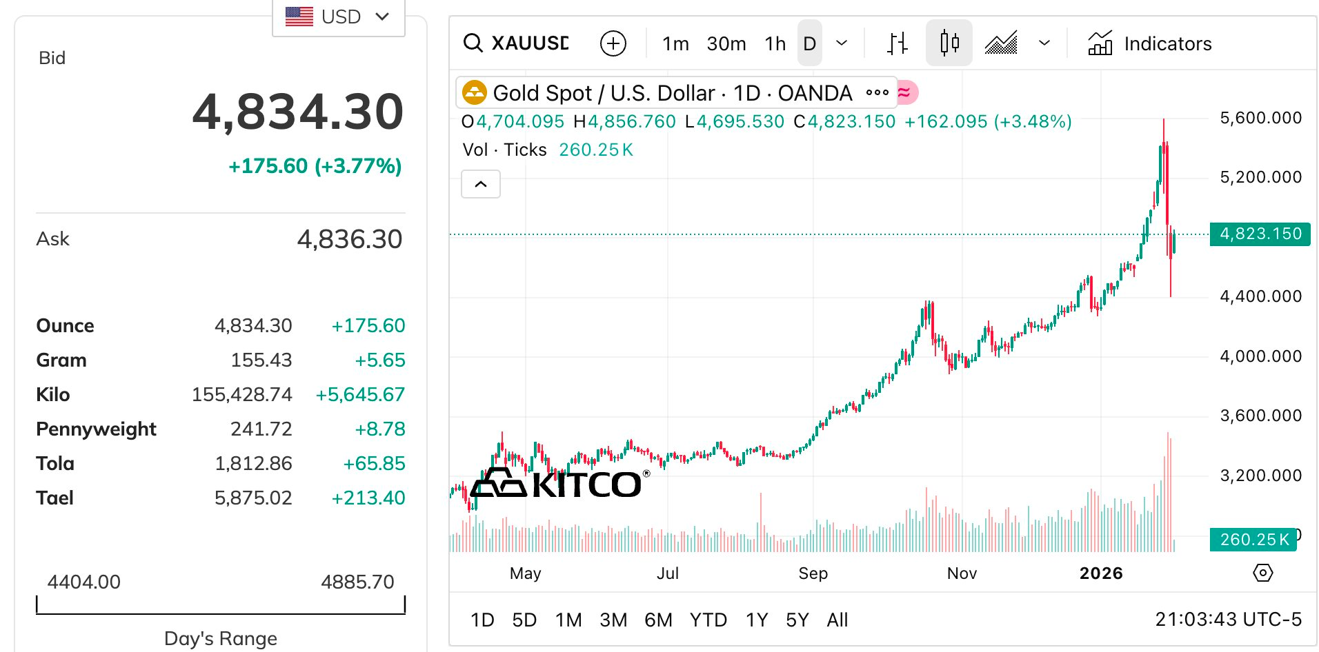 Trạng thái “nằm im” quan sát của quỹ vàng lớn nhất thế giới được cho là khá thận trọng trong bối cảnh giá vàng vừa trải qua giai đoạn biến động mạnh. Cập nhật sáng 3/2, giá vàng thế giới giao ngay ghi nhận ở mức 4.834 USD/ounce, tăng 3,5% so với mức đóng cửa hôm qua (theo Kitco).