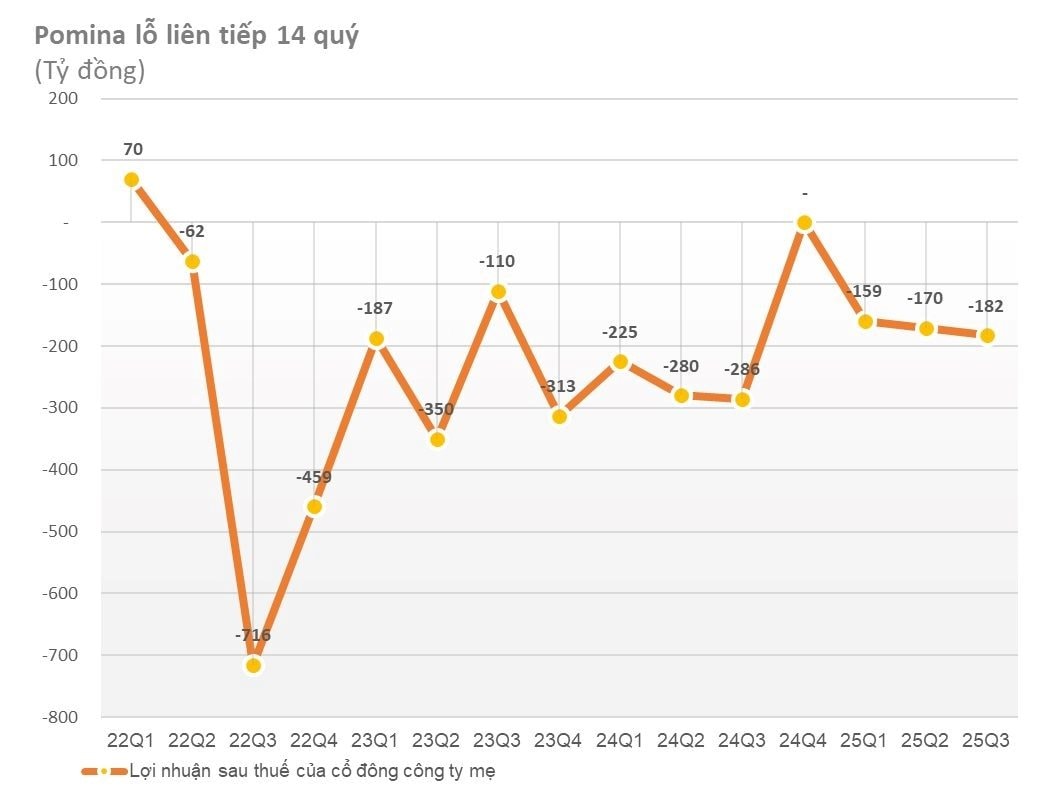 Tính đến cuối quý III/2025, Pomina ghi nhận lỗ lũy kế hơn 3.000 tỷ đồng, vốn chủ sở hữu âm 186 tỷ đồng. Tổng tài sản đạt hơn 9.000 tỷ đồng nhưng nợ phải trả đã vượt 9.200 tỷ đồng, trong đó dư nợ vay tài chính ngắn và dài hạn lên tới hơn 5.900 tỷ đồng, chủ yếu là vay ngắn hạn.